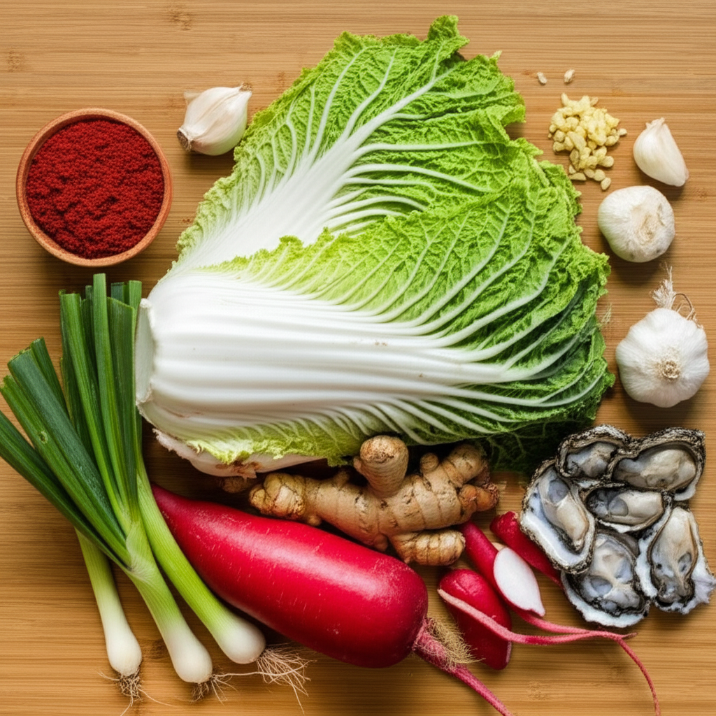 무채, 쪽파, 갓, 미나리는 김치에 시원함 더해요. 요즘은 과일 갈아 넣어 자연 단맛 내기도 하죠. 양념 비율에 이 재료들을 잊지 마세요.