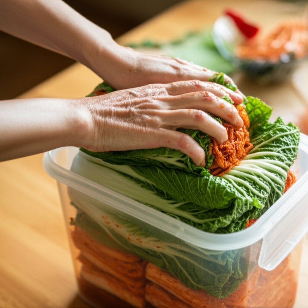 양념 바른 배추는 겉잎으로 감싸 공기 접촉 차단. 김치가 마르거나 맛 변하는 것을 막아줘요. 김치통에 꾹꾹 눌러 담아 공기 접촉 최소화해야 오래 맛있게 먹을 수 있습니다.