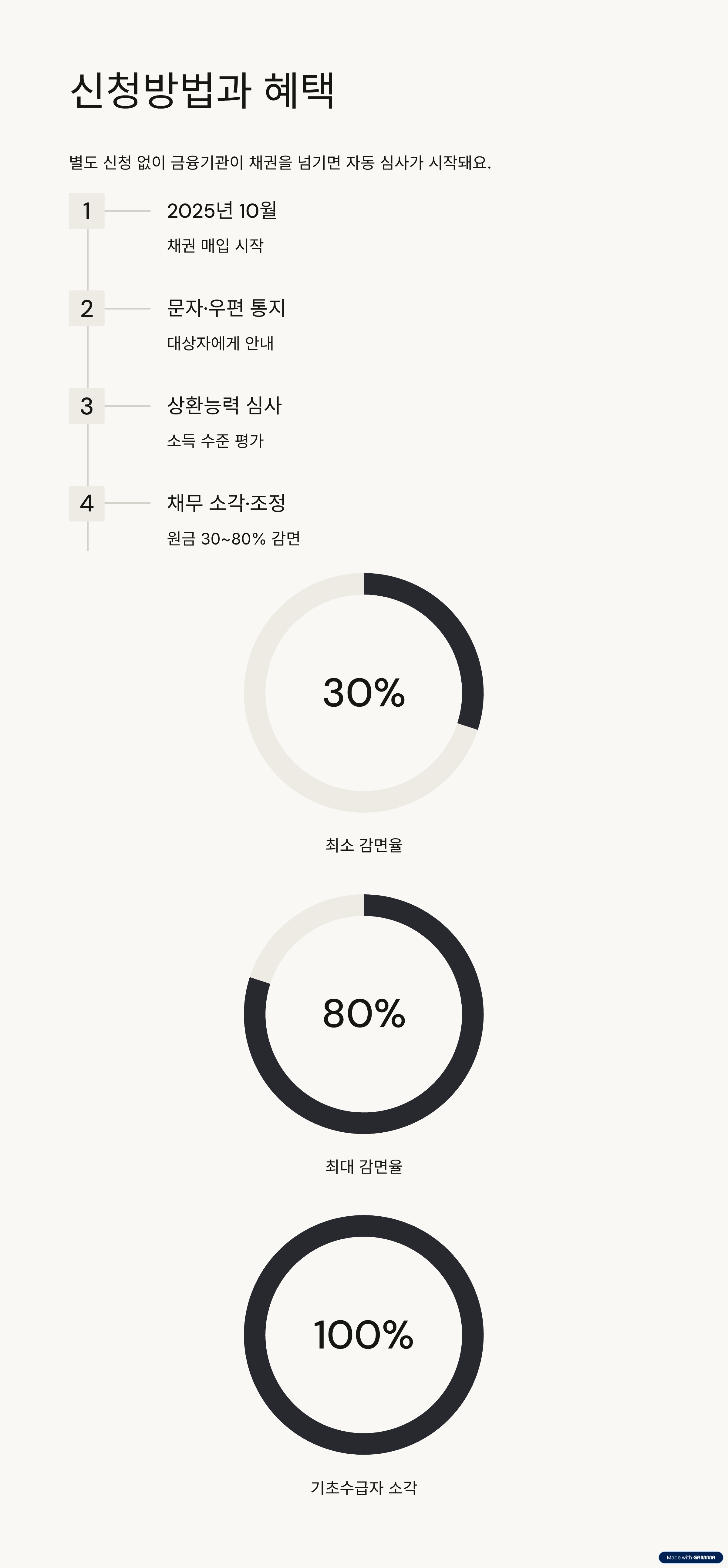 통장 압류나 신용불량 상태라면 우선순위가 높아지죠. 예를 들어, 3,000만 원 대출이 7년 넘게 연체됐다면 대상이 될 가능성이 높아요. 단, 담보 채무나 5,000만 원 초과분은 제외되니 이 점 꼭 확인하세요. 📌