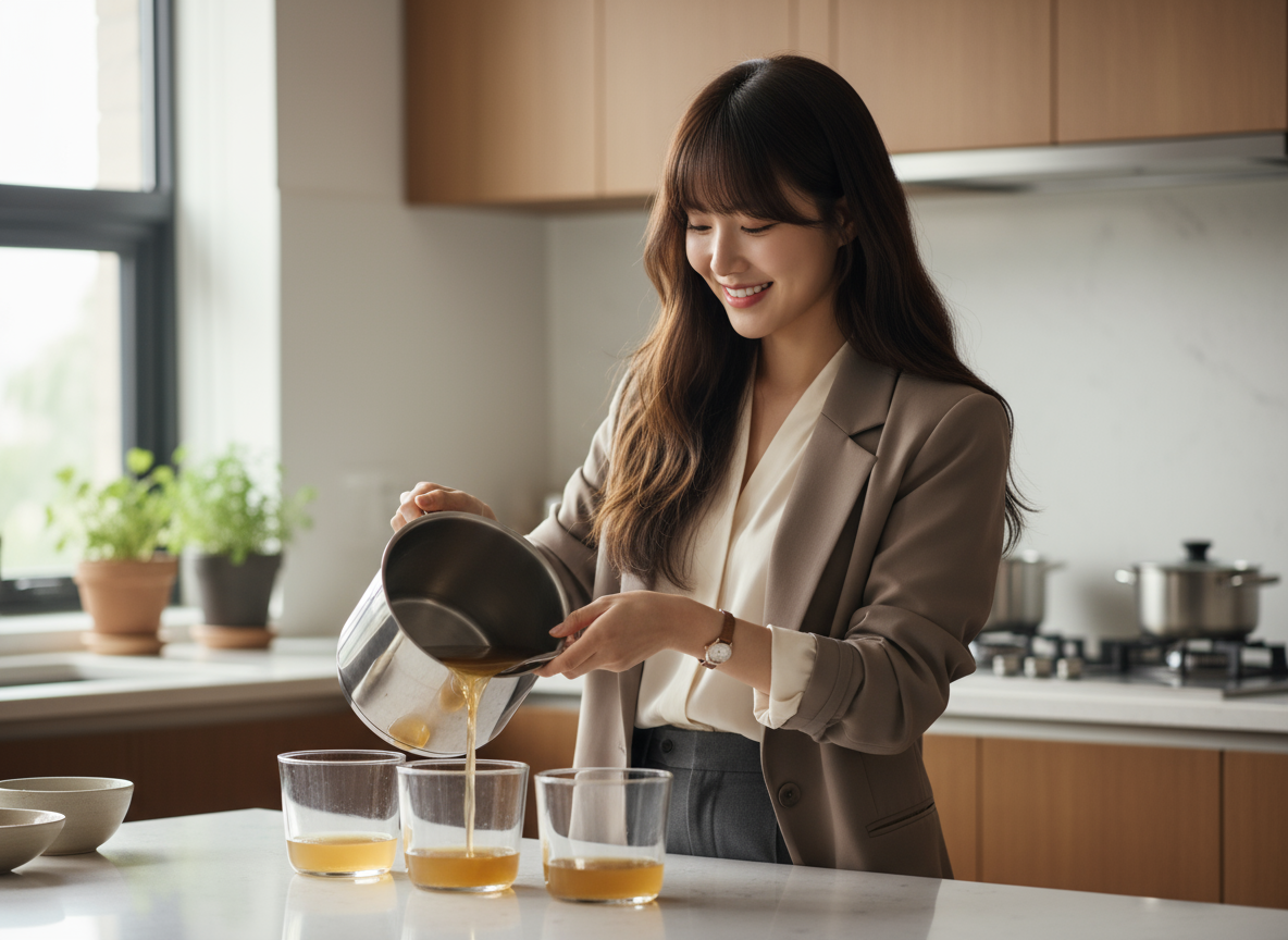 완성된 육수는 건더기를 체에 밭쳐 깨끗하게 걸러낸 후, 반드시 차갑게 식혀서 사용해야 합니다. 뜨거운 육수는 찹쌀풀과 섞일 때 덩어리가 지거나 고춧가루의 색을 검게 만들 수 있으니 주의하세요. 이것이 김장김치 육수만드는법의 마지막 핵심 포인트입니다.
