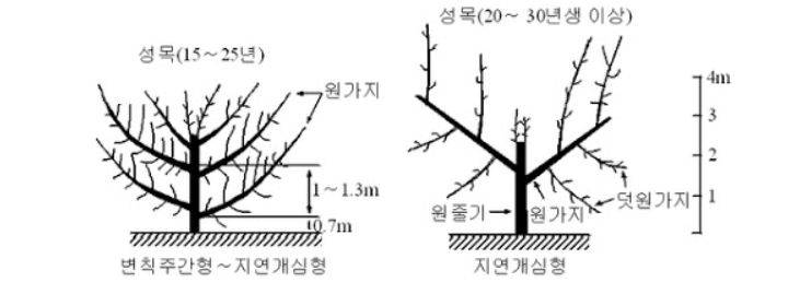 이런 경우에는 수간이 극히 조밀한 예를 제외하고는 가지를 하향 40도 각도 잡아 주어 힘을 조절하고 과실을 많이 수확하는데 역점을 두고 가지치기에 임해야 한다.