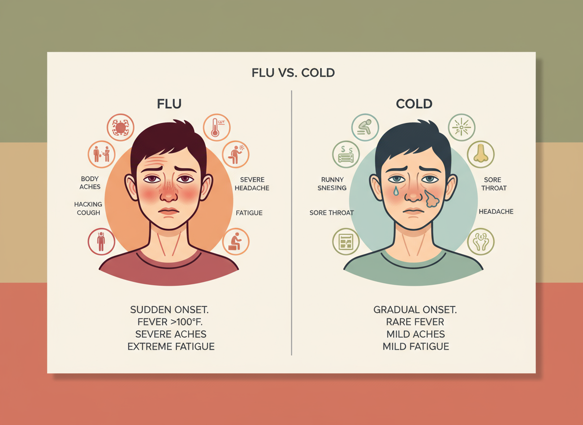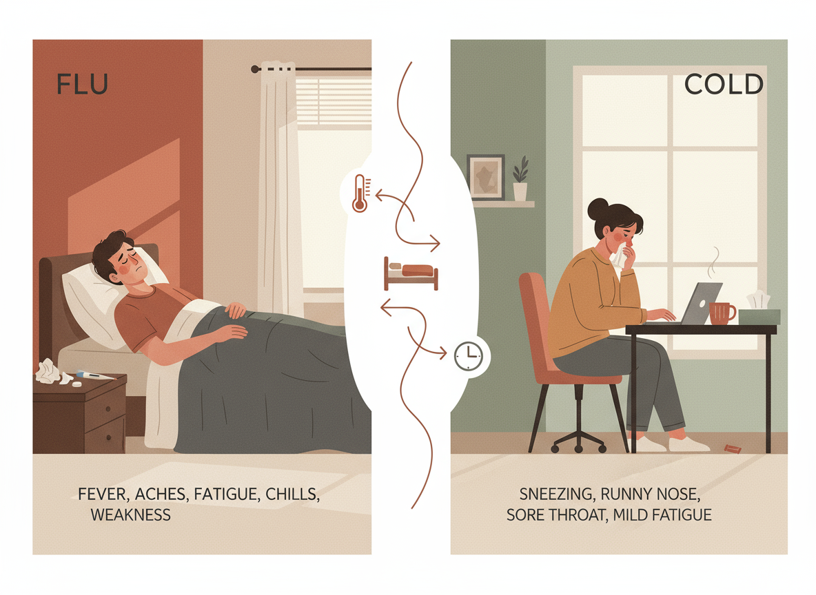 감기는 콧물, 코막힘, 가벼운 인후통이 서서히 나타나지만, 독감은 갑작스럽게 고열과 전신 증상이 동시에 찾아옵니다.