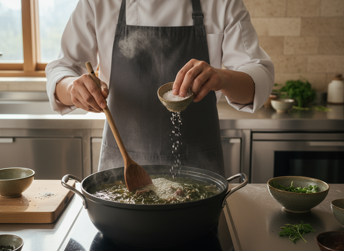💧 3. 감칠맛의 핵심: 국물과 간 맞추기 (미역국 간맞추기)