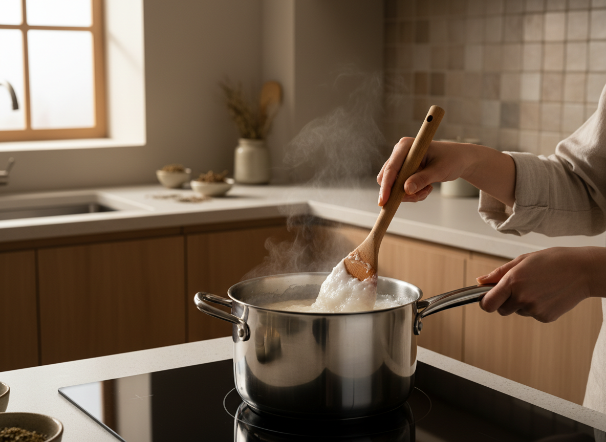 (뜨거운 풀을 넣으면 김치가 빨리 쉴 수 있어요!) 찹쌀풀은 양념이 재료에 잘 붙게 하고, 유산균의 먹이가 되어 김치가 맛있게 익도록 도와줍니다.