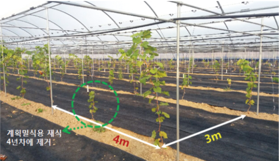 유럽계 포도의 수관 확장량은 왕성한 편으로 유목기 때부터 세력을 안정시켜 단초전정 재배를 할 경우 열간격과 주간거리를 3m∼4m로 하는 것이 적당하다. 유럽계 포도는 신초 1본 당 12매 이상의 잎을 확보해야 하므로 열간 거리를 3m 이상으로 넓게 심는 것이 고품질 과실 생산에 유리하다.