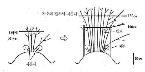 1.5~2cm 간격으로 단단하게 세운 지주(직경 25mm 정도의 파이프) 를 두둑 양 끝에 세우고 20cm*20cm 눈의 네트를 수평으로 2단 설치한다. 1년째는 초장이 낮으므로 1단 네트를 높이 40cm정도의 위치에 설치한다. 초장이 높아짐에 따라 위쪽이 흩어지면 60cm 높이고 고정한다. 2단째는 높이 1m 위치에 고정한다.