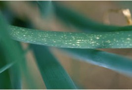 증상 : 잎에 방추형의 갈색 반점이 생기고, 담흑색의 가루형 곰팡이가 생김.