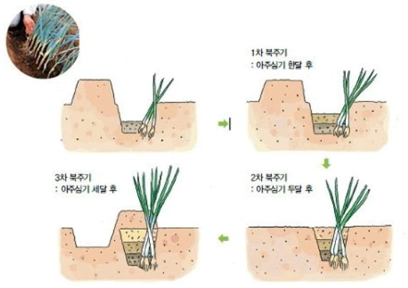 파의 연백부를 길게하기 위해서 두세차례로 나누어 북주기를 실시하는 것입니다.