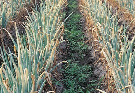 파 굴파리와 파총채벌레에 의해 폐허가 된 파밭.
