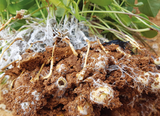 - 땅콩잎이 황갈색으로 변하다 흑갈색으로 되어 땅콩잎 앞면에 회색곰팡이가 생겨 썩으며 낙엽이 되어 잎이진다.