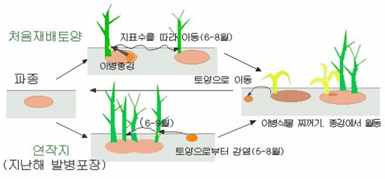 - 유기물이 많고 산성인 토양에서 발생이 심하며, 모래가 많은 토양과 고온다습한 환경에서 피해가 심하다.