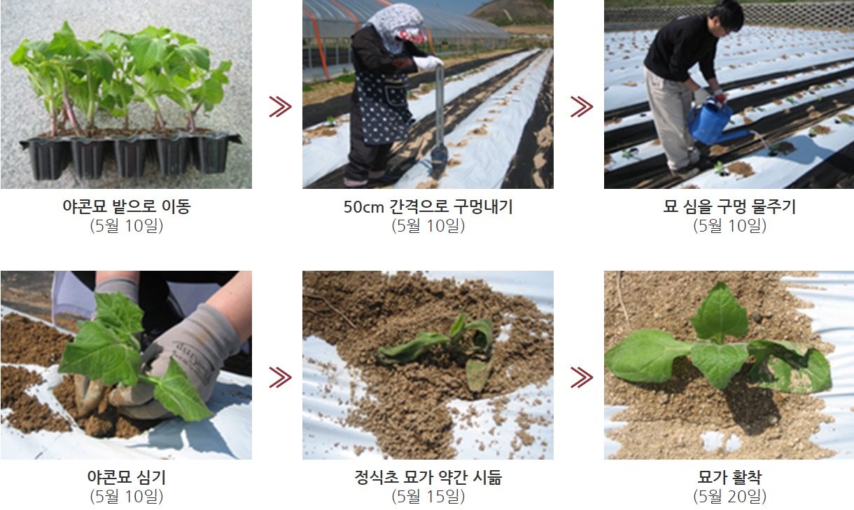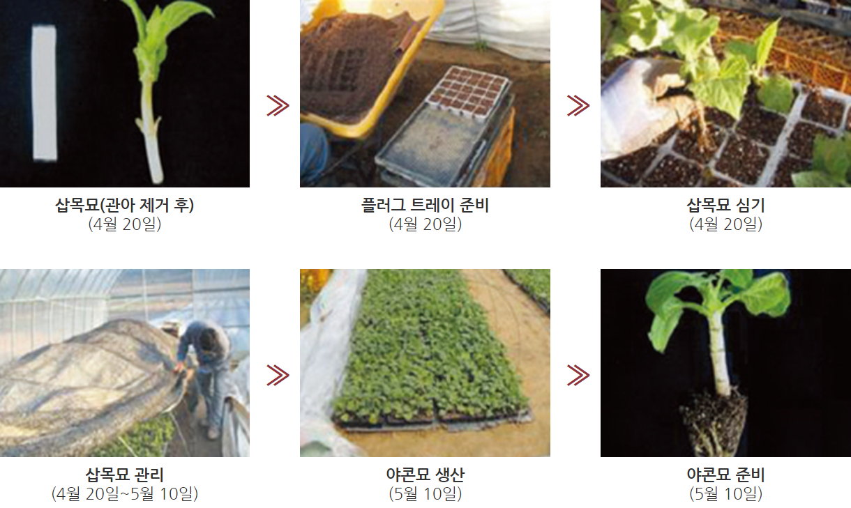 4월 중순에 잎이 2~3매일 때 상토(모판흙)를 담은 50공 트레이에 삽수를 심어 3~4주 정도 삽목 육묘한다. 5월 상~중순에 3~4주 육묘한 야콘묘가 생성되면 밭에 심는다.