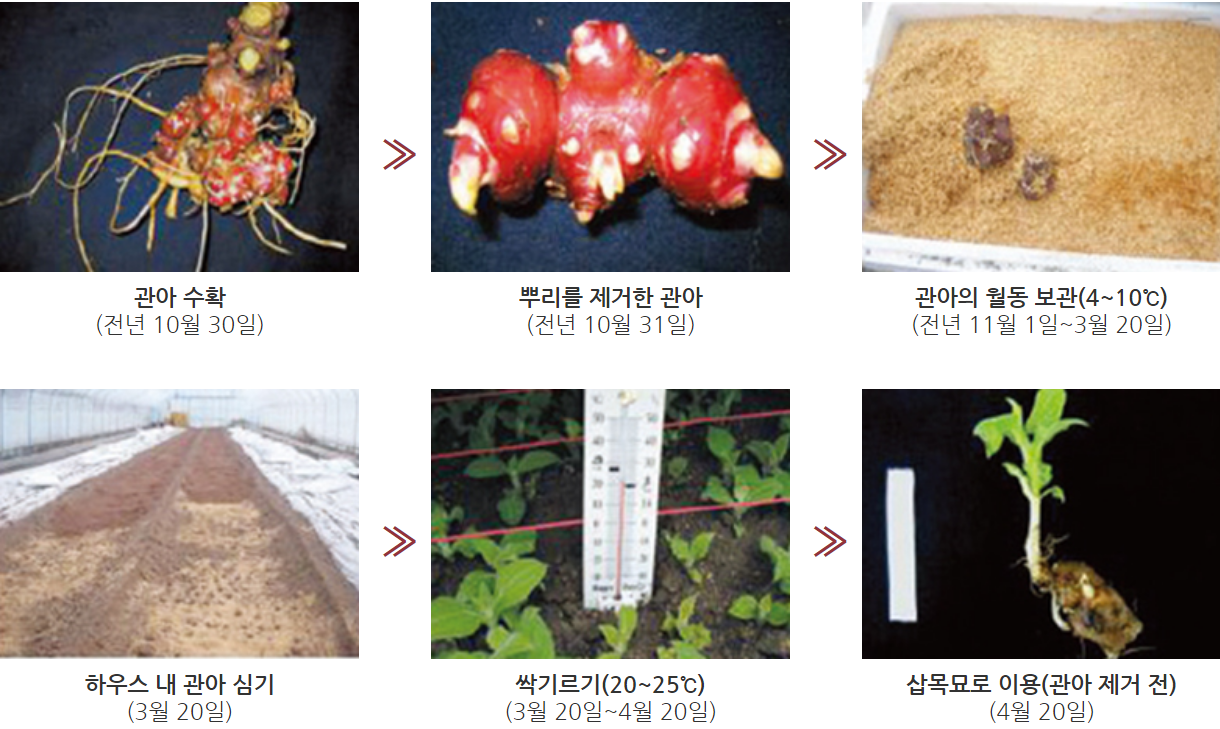 관아를 직접 땅에 심는 것보다 삽수를 육묘하여 묘를 심는 것이 수량이 많고 품질이 우수하다.