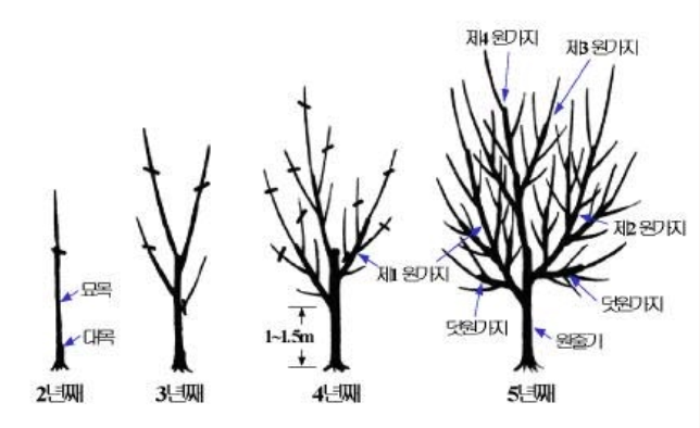 제 1원가지를 지상 1~1.5m에 만들고, 이어서 약 0.5~1m 간격으로 방향을 보면서 제2, 3으로