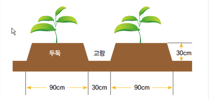 - 1줄재배(두둑 : 80~90cm, 고랑 : 30~40cm)